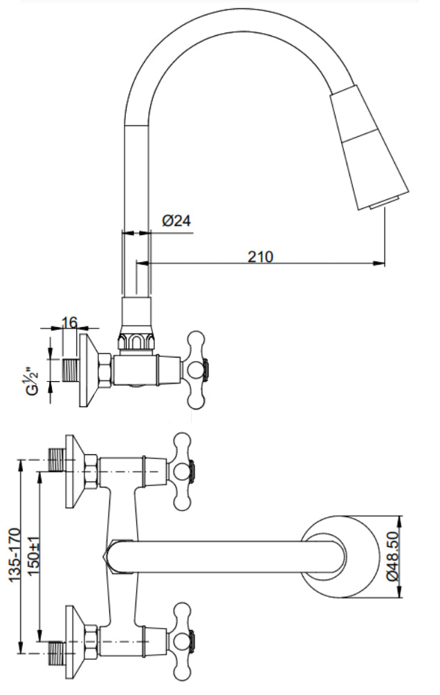 - Type: mitigeur mural cuisine/salle de bain avec bec flexible;
