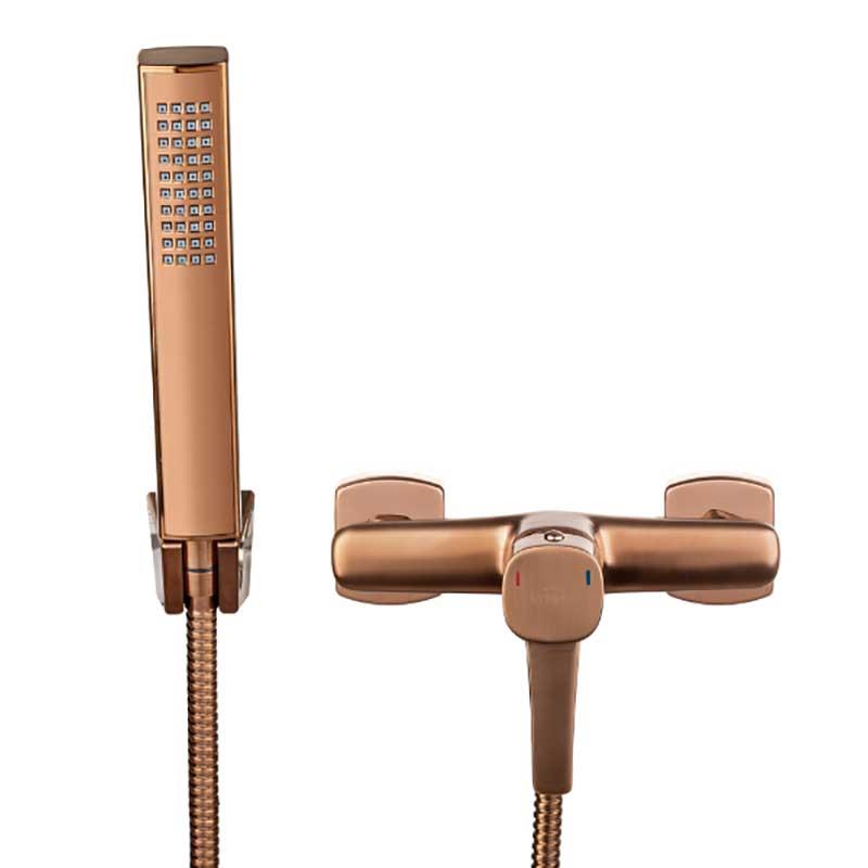 Mitigeur de douche de salle de bain design de couleur bronze cuivré de la série GLAMOUR Invena. Ce mitigeur de douche mural pour salle de bain est livré avec un flexible de douche, une pomme de douche et un support mural pour pomme de douche. Il s'agit d'un mitigeur de douche à levier unique. La distance entre deux arrivées d'eau est de 150 mm. Cette valve de douche est une excellente alternative pour les amateurs de minimalisme manifesté dans le style industriel ou loft. La pomme de douche dispose de 3 types de jets, grâce auxquels les soins quotidiens deviendront encore plus agréables.