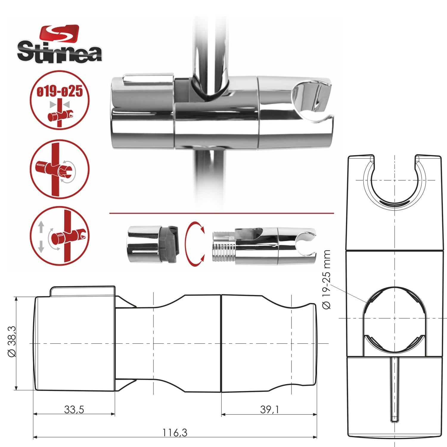 - Odpowiedni do drążków o średnicy od 18mm do 25mm;