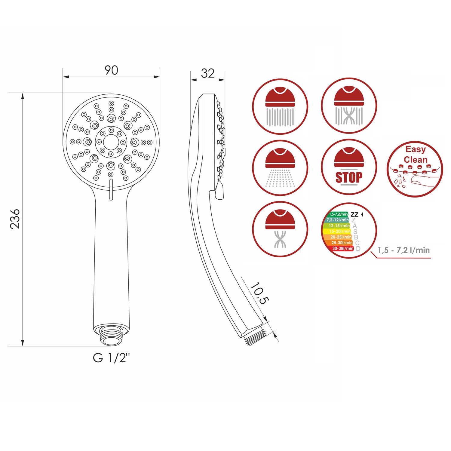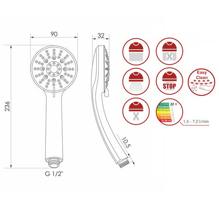 - Funkcje: spray, mgiełka, masaż, spray z masażem, stop.