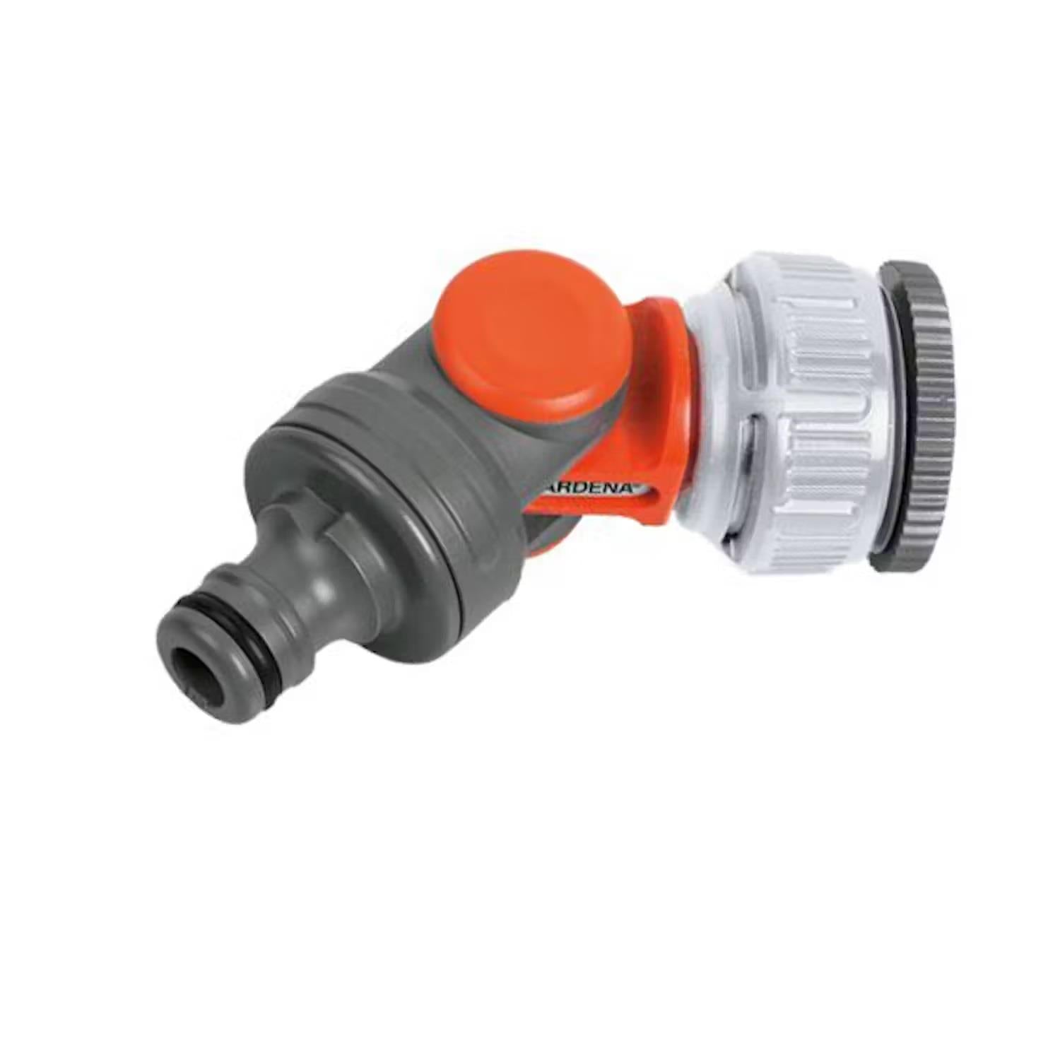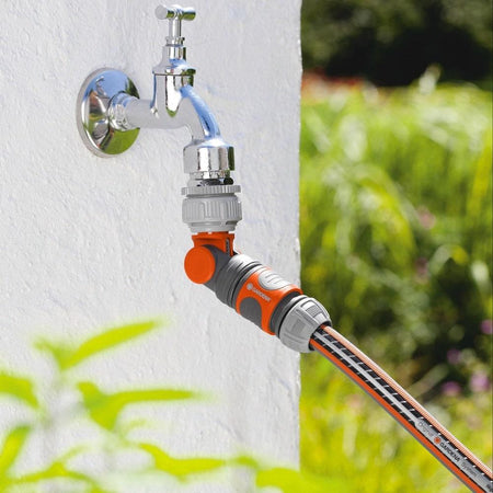 With the gardena angled swivel tap connector, the gardena system connection of a hose to the tap is possible. The connector can be rotated and swivelled. This prevents kinking and twisting of the hose at the tap. The water can always flow unobstructed and the hose is not damaged. It is also ideally suited for use on the hose trolley. The tap connector is suited for taps with 1" and 3/4" thread.