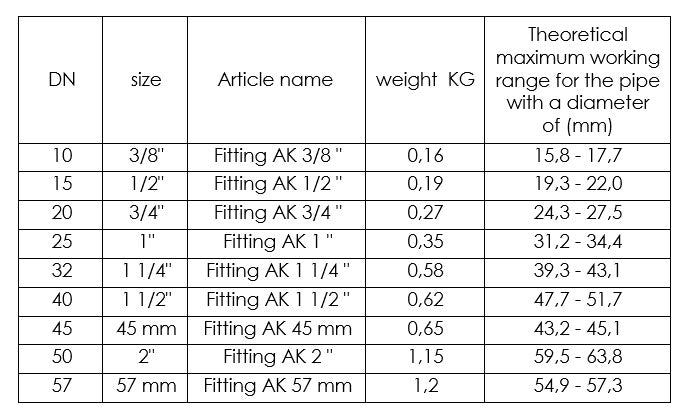 • For pipes with theoretical range of application as shown in the table;