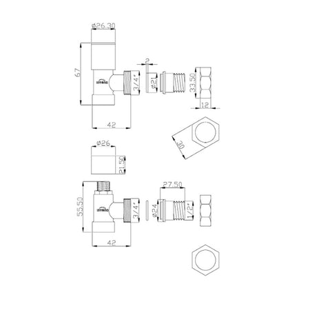 Exclusive black thermostatic set intended for connecting an angular decorative radiator od panel heater with side connections. Valves can provide manual control of the water flow.