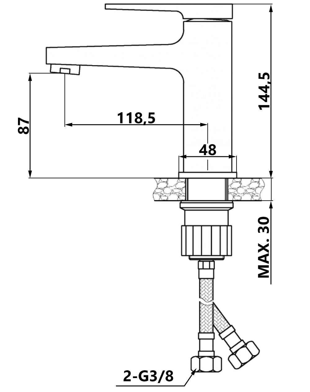 - Set includes: black click-clack plug, 2x 3/8" BSP 40cm inlet hoses and mounting parts;