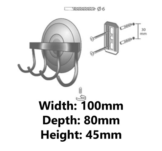 4-hook strip mounted to the wall with screws. Made of zamak in antique brass.
