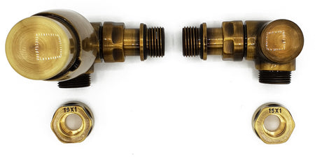 Left Version with Copper (Cu) Connectors Antique Brass Thermostatic + Lockshield Angled Valve Set Double-Pipe Radiator