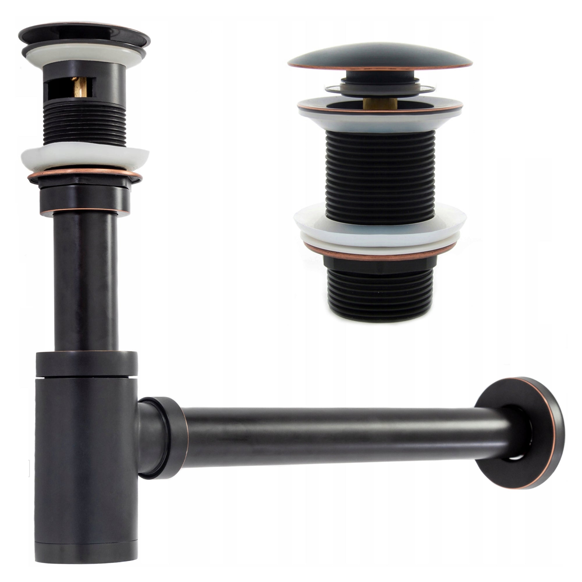 The bottle trap is an essential element of the basins plumbing that keeps the bathroom hygienic and clean. When we use the basin, the used water goes through the basin waste, into the drainage pipe and then into the sewer. Lot of other waste and dirt is accumulated in this sewer and naturally the accumulation causes a lot of harmful gases. These gases need an outlet and that, they get through our drainage pipes, through the wastes and back into our bathrooms. The bottle trap prevents these gases to enter the bathrooms, thus helping maintain hygiene in the bathroom and keeping it safe for us. Addictionaly set includes modern and very good looking sink/basin waste click-clack made of solid black powder coated metal.