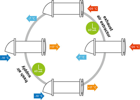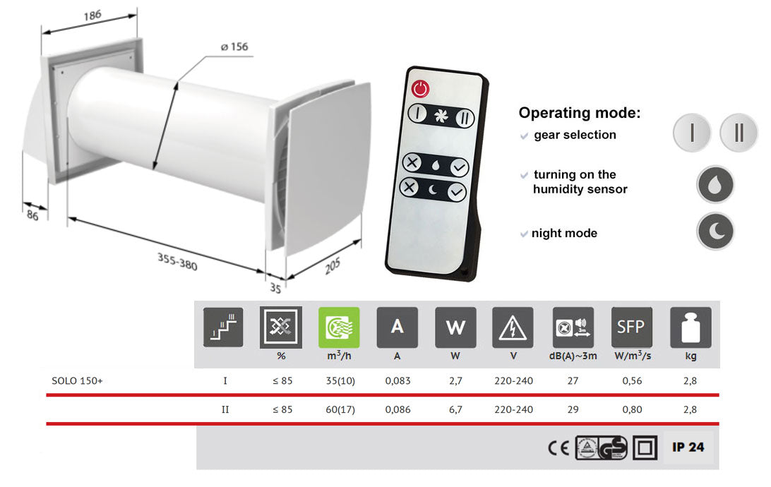 SOLO+ series ventilation device for individual areas is the most suitable solution for utility rooms, closets, and cloakrooms. The fan works in two separate cycels. In first cycle warm, stale air removed from the room flows through the heat exchanger, transferring heat and moisture. After 60 seconds of heating the heat exchanger, the ventilation unit switches to the supply mode. In second cycle fresh, cool air from outside flows through the heat exchanger. The air is humidified and heated by the heat previously collected in the exchanger. After 60 seconds, the fan switches back to exhaust mode and the cycle repeats. It is equipped with humidity sensor that can be controled and operates the device. Using the included plastic screwdriver, set the required humidity level on the potentiometer in the range of 60-90%. If the humidity in the room exceeds the set value, the device automatically turns on and works until the humidity returns to normal. Mounted though wall and operated by the remote control.